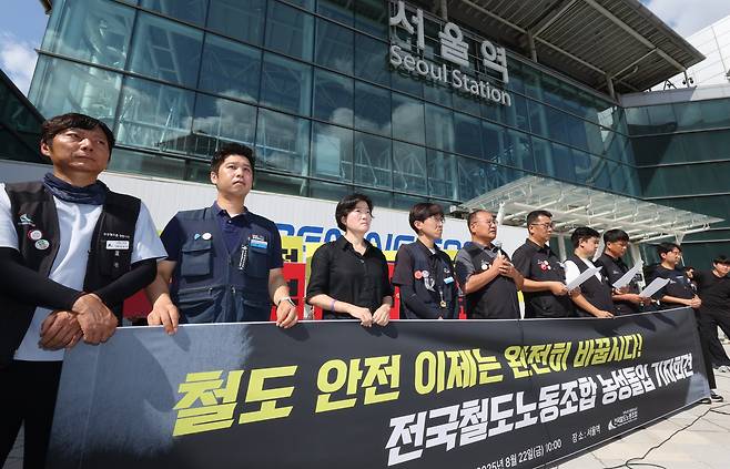 | ▲ 전국철도노조 소속회원들이 8월 22일 서울역에서 청도 열차사고 관련 열차 운행선상 작업 중단 요구 기자회견을 하고 있다. |