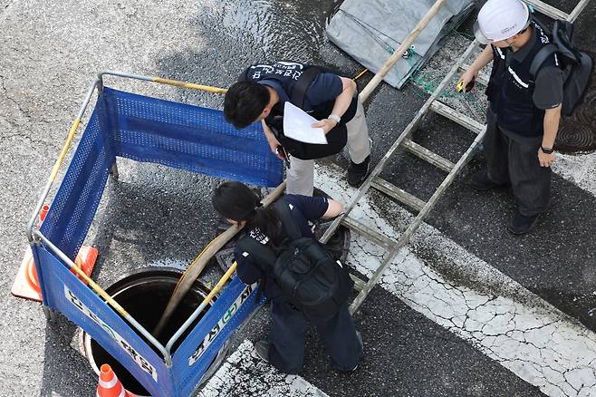 | ▲ 8월 25일 서울 염창동 맨홀에서 작업자 한 명이 내부로 휩쓸려 가는 사고가 발생, 관계자들이 현장에서 조사를 하고 있다. |