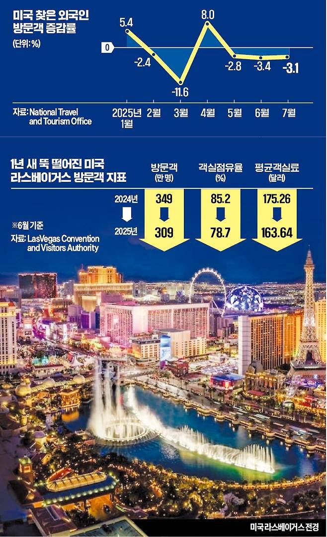 14일 관광업계에 따르면 관광산업 조사기관 투어리즘이코노믹스는 올해 미국을 찾은 외국인 관광객 지출이 83억달러(약 11조620억원)로 전년 대비 4% 이상 감소할 것으로 내다봤다. 세계관광여행협의회(WTTC)는 최대 125억달러(약 17조5000억원)의 수입이 감소할 것이란 예상을 내놓기도 했다. 뉴욕, 라스베이거스 등 주요 관광도시 내 중저가 호텔의 매출 감소세는 더 뚜렷하다. 일부 호텔 체인은 객실 요금을 인하하며 버티고 있는 것으로 알려졌다.