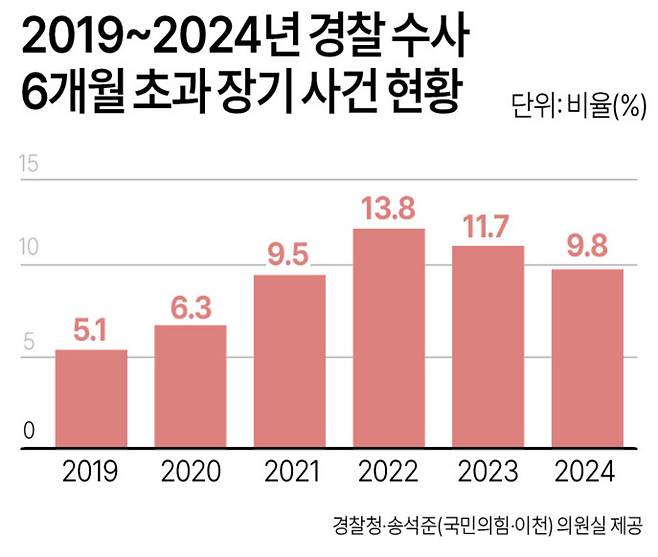 검찰청 폐지를 골자로 한 정부조직 개편안이 추진되면서 경찰 수사부서의 업무 부담이 커질 수 있다는 우려가 나온다. 최근 5년간 경찰의 범죄 사건 처리기간을 보면 6개월 이상 걸린 장기 사건 비율이 2021년 검경수사권 조정 이후 매년 늘어나 두 배가량 높은 수준을 유지하는 것으로 나타났다.