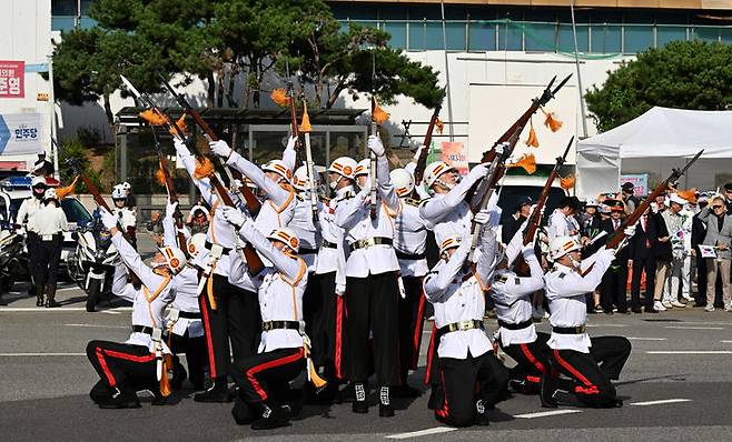 [서울=뉴시스] 14일 동인천역 남광장 일원에서 열린 제75주년 인천상륙작전 기념 거리퍼레이드에서 해병대 의장대가 공연을 하고 있다. (사진=인천시청 제공) 2025.09.14. photo@newsis.com *재판매 및 DB 금지