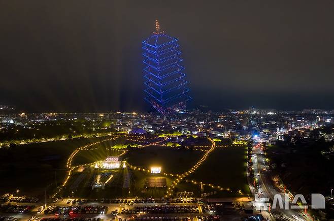 [경주=뉴시스] 사진공동취재단 = 12일 경주 대릉원 동편 쪽샘지구에서 개막한 ‘2025 세계유산축전 경주역사유적지구’ 공연에서 황룡사 9층 목탑을 형상화한 1천 대 드론이 밤하늘을 수놓으며 경주 도심을 밝혔다. APEC을 앞두고 세계유산의 가치와 의미를 널리 알리기 위해 마련된 이번 축전은 석굴암, 불국사, 첨성대, 양동마을, 옥산서원 등 경주 전역에서 10월 3일까지 이어진다. 2025.09.14. photo@newsis.com