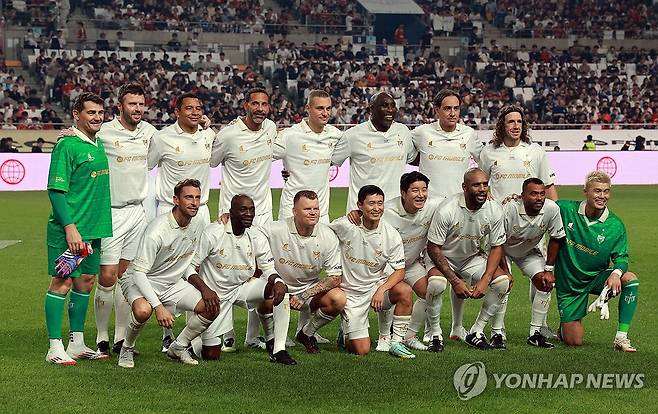 (서울=연합뉴스) 한종찬 기자 = 14일 서울월드컵경기장에서 열린 2025 넥슨 아이콘 매치. 실드 유나이티드 선수들이 경기에 앞서 기념촬영을 하고 있다. 2025.9.14