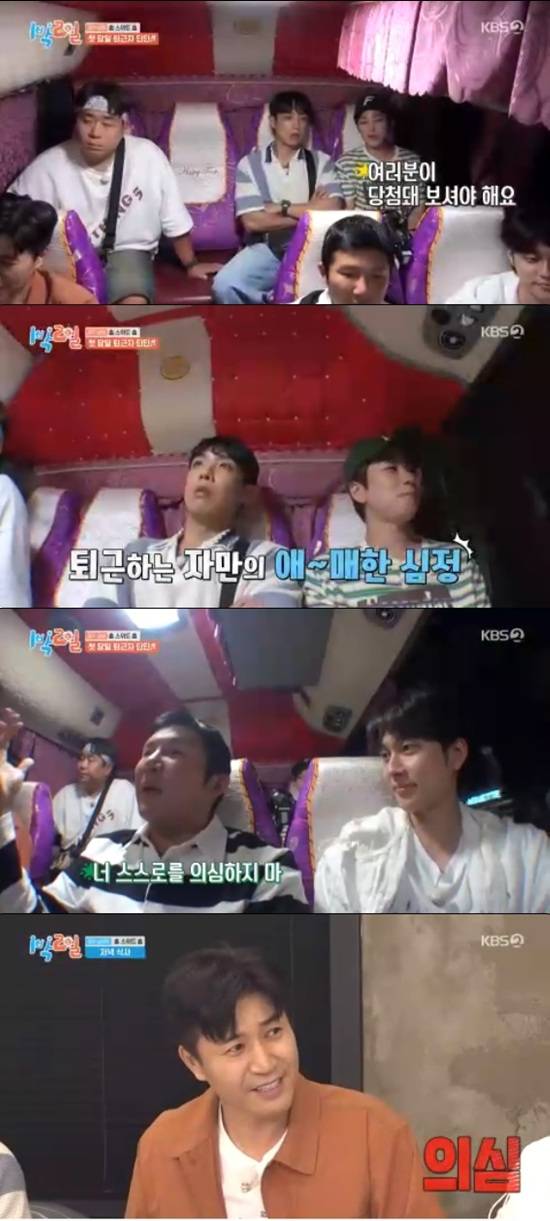 딘딘은 당일퇴근이 결정된 심정에 대해 "복잡하다. 당장 내려서 가고 싶은데 이게 약간 애매하다"고 말했다. 조세호는 딘딘에게 "너 스스로를 의심하지 말라"고 했다.