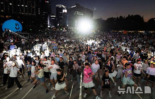 [서울=뉴시스] 김선웅 기자 = 14일 서울 중구 서울광장에서 '케이팝 데몬 헌터스'를 소재로 열린2025 서울 헌터스 페스티벌에서 참여 어린이들이 댄스를 선보이고 있다. 2025.09.14. mangusta@newsis.com