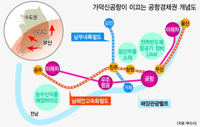 동남권 공항 경제권의 핵심 사업으로는 수소를 포함한 신재생에너지와 미래 모빌리티, 콜드체인 산업 등이 꼽힌다. 부산의 대한항공 테크센터와 제2에코델타시티에 추진하는 우주산업 클러스터는 울산의 미래 차 산단과 경남의 항공국가산단, 더 나아가 광주의 자율주행 부품단지까지 연결해 남부권을 도심항공교통(UAM)과 미래 차를 포함한 미래 모빌리티 산업의 글로벌 거점으로 키울 수 있다.