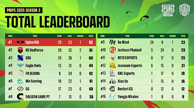 DK는 14일 온라인으로 열린 펍지 모바일 프로 시리즈(PMPS) 시즌2 서킷 스테이지 3일 차 경기에서 치킨(최후 생존) 1마리 포장에 성공하며 도합 82점을 누적, 정상을 차지했다.