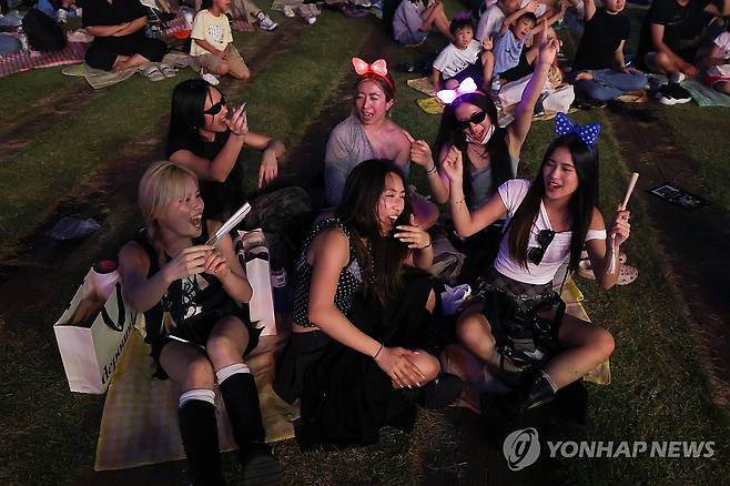 (서울=연합뉴스) 서대연 기자 = 14일 서울 중구 서울광장에서 열린 2025 서울헌터스 페스티벌에서 외국인 관광객들이 넷플릭스 애니메이션 '케이팝데몬헌터스' 수록곡 '골든'을 부르고 있다. 2025.9.14