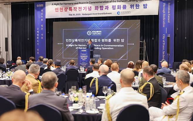 [서울=뉴시스] 권오을 국가보훈부 장관이 14일 오후 인천시 중구 하버파크호텔에서 열린 제75주년 인천상륙작전 전야만찬에 참석하여 축사를 하고 있다. (사진=국가보훈부 제공) 2025.09.14. photo@newsis.com *재판매 및 DB 금지