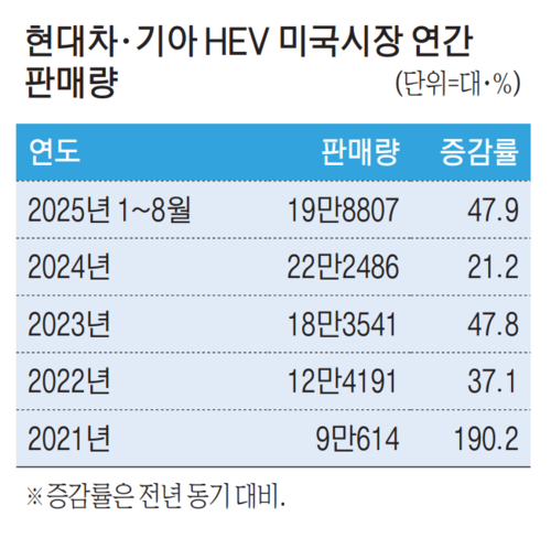 현대차그룹은 미국 내 HEV 생산기지가 없어 대부분을 한국에서 만들어 수출하고 있고 이에 따라 관세 25%라는 족쇄를 피하기 어렵다.