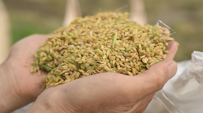 이것이 '해들'이라는 품종이고 김포에서 첫 수확을 하는 벼입니다. 땡글땡글하게 잘 익었죠? 작년보다 훨씬 상태가 좋은 것 같습니다.