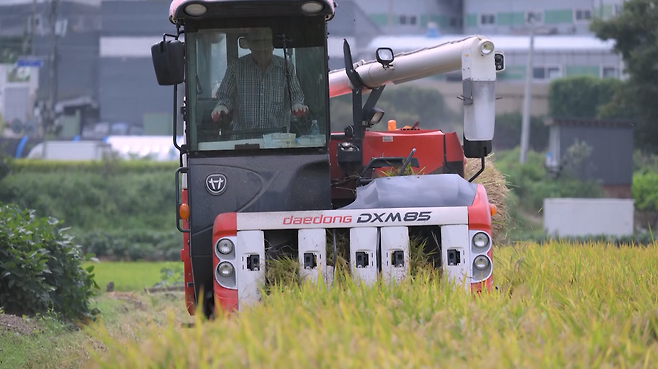 잘 여문 벼 이삭들이 차례대로 베여 콤바인에 실립니다.