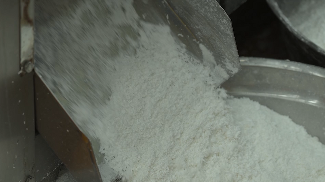 쌀을 얼마나 곱게 잘 빻느냐에 따라서 다음 공정으로 이어져서 떡이 제품으로 나왔을 때 저희가 추구하는 회사가 추구하는 떡 반죽의 질감과 식감이 결정돼요. 여기서 잘못되면 뒤에서 아무리 잘해도 늘 똑같은 최상의 품질의 떡을 만들 수가 없어요.