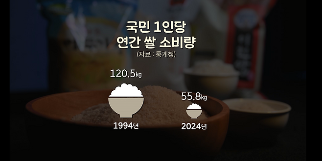 지난해 국민 1인당 연간 쌀 소비량은 56kg. 30년 만에 절반 수준으로 줄어들었습니다.