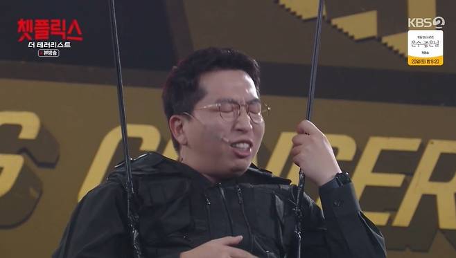 이어 '챗플릭스'에선 '더 테러리스트'로 등장했다. 정범균이 위에서 와이어를 타고 내려오자 채팅에선 '스케일은 큰데 재미는 없다'라고 말했다. 정범균은 와이어를 풀어달라고 했지만, "다시 올라가요"란 말에 다시 올라갔다.