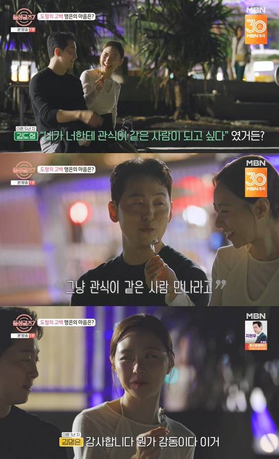명은은 "내 친구들이 '네 머리 위해서 네가 뭘 하는지 다 알아서 흐뭇하게 바라보며 잘 맞춰 주는 사람을 만나라'고 말하더라. 그런 사람이려면 경험치가 많이 쌓인 사람이어야 되는 거잖아"라고 밝히며 9살 연상인 도형을 염두한 건지 의미심장하게 만드는 이상형을 언급했다