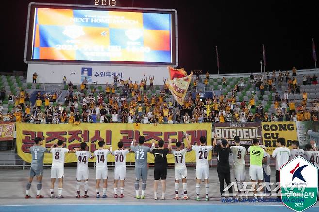 이정효 광주FC 감독이 14일 K리그1 29라운드 원정에서 수원FC를 4대2로 꺾고, 리그 5위에 오른 후 '절친' 정경호 강원FC 감독을 언급했다. 정 감독은 이 감독과 P급 라이선스 교육을 같이 받은, '절친' 선후배 사이다. 이날 올시즌 최다 4골을 터뜨리며 수원을 꺾고 승점 41점을 적립한 광주는 전날 서울을 꺾은 '승점 41점' 강원을 다득점 3골 차, 6위로 밀어내고 5위에 우뚝 섰다.