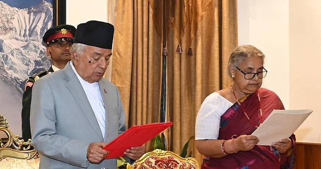| 취임 선서하는 새 여성 총리 네팔의 반(反)정부 시위로 사실상 정권이 붕괴된 가운데 12일 수도 카트만두의 대통령궁에서 임시 총리로 임명된 수실라 카르키 전 대법원장(오른쪽)이 람 찬드라 푸델 대통령에게 취임 선서를 하고 있다. 카트만두=AP 뉴시스 |