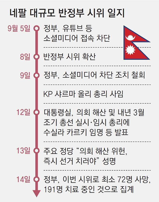 8일 시작된 시위는 정부가 5일 허위 정보 확산 방지를 이유로 유튜브, 페이스북, X 등 26개 소셜미디어 접속을 차단하면서 시작됐다. 시위대는 “정부가 온라인에서 벌어지는 반부패 운동을 억압하려 한다”고 반발하며 거리로 나섰다. 정부 부패, 무능, 경제 불안 등에 불만을 가진 젊은 층이 대거 가담하면서 시위는 수도 카트만두를 비롯해 남동부 비라트나가르, 서부 포카라 등으로 확산됐다. 시위가 폭력 사태로 번지자 네팔 당국은 통행금지령을 내리고 군 병력을 투입했다. 이 과정에서 시위대와 경찰, 탈옥한 수감자 등 최소 72명이 숨졌다. 1300명이 넘게 다쳤으며 이 중 191명이 현재 병원에서 치료를 받고 있다.