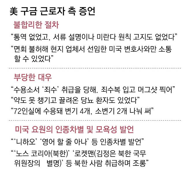 미국 조지아주 포크스턴의 이민세관단속국(ICE) 시설에 7일간 구금됐던 한 근로자는 현지 요원들로부터 이런 발언을 들었다고 토로했다. 아시아인을 중국인으로 뭉뚱그려 부르거나 언어 능력에 대한 편견을 드러낸 것으로, 인종차별적 발언으로 통한다. 구금자들은 충분한 법적 고지 없이 체포됐고, 곰팡이가 핀 침대에서 70여 명이 취침하는 등 열악한 시설에 수용됐던 것으로 드러났다. 한 근로자는 “영화에서만 보던 죄수 취급을 당했다”고 했다.