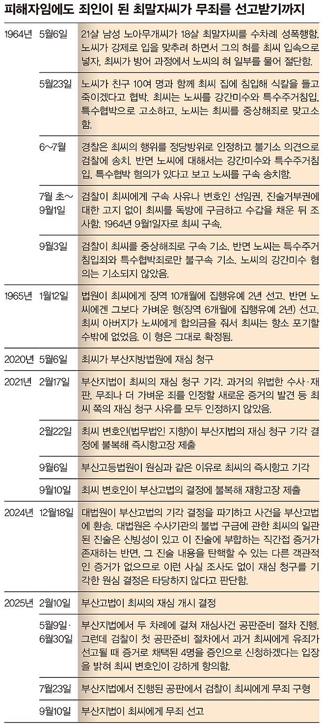 이후 부산고법의 재심 개시 결정으로 부산지법에서 재심사건 공판이 진행됐고, 검찰은 2025년 7월23일 최씨에게 무죄를 구형했다. 그로부터 한 달 반이 지난 9월10일, 최씨는 마침내 무죄를 선고받았다. 60년. 최씨가 잘못된 판결을 바로잡기까지 흐른 세월이다. 피해 발생일을 기준으로 하면 최씨가 억울함을 푸는 첫걸음을 떼기까지 무려 61년이 걸렸다.
