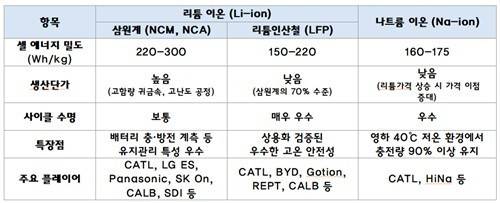 나트륨이온 배터리는 생산 단가가 낮고 열·화학적 안정성이 높아 화재 위험이 낮으며 영하 40도에서도 충전량 90% 이상을 유지하는 등 저온에서 성능이 크게 저하되지 않는 점이 장점으로 꼽힙니다.