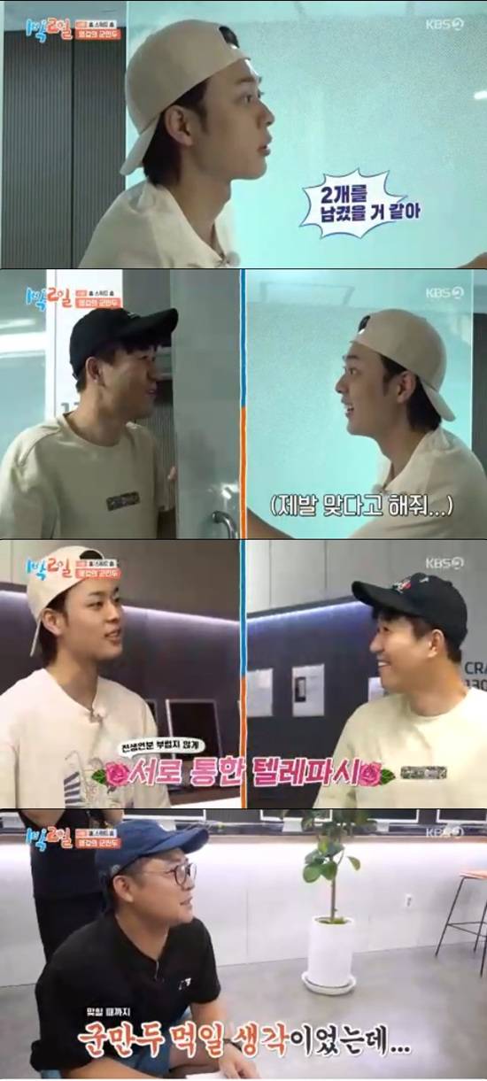김종민은 "나 소름돋았다. 대박이다"라며 접시를 가져와 만두 2개를 보여줬다. 유선호가 만두 1개를 남기면서 두 사람은 한 번에 미션을 통과했다.