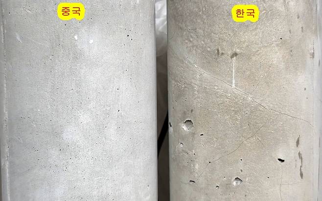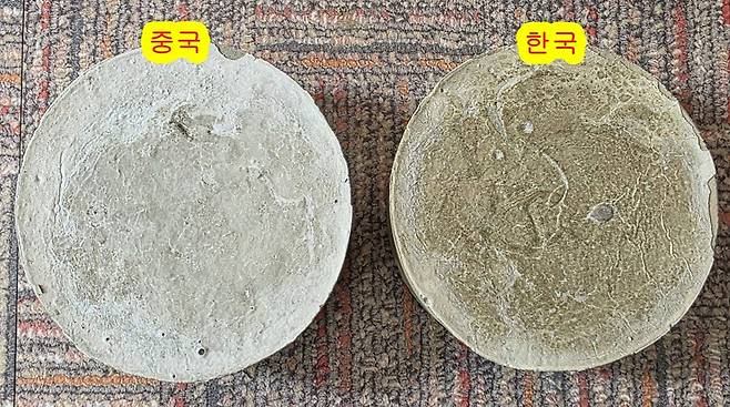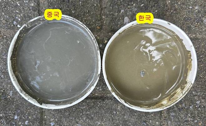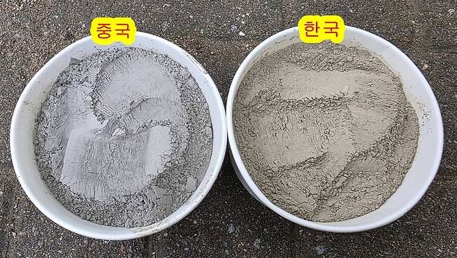 | ▲ 회색빛의 중국산 시멘트와 누런빛의 한국산 시멘트 |