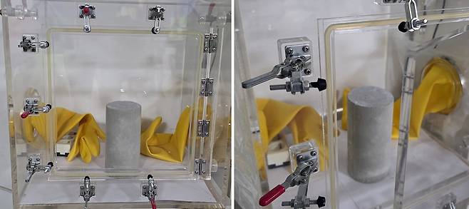 | ▲ 체임버 안에 잘 건조된 공시체를 넣고 3일 뒤 문을 열자 한국산은 악취가 진동했지만, 중국산은 악취가 전혀 없었다. |
