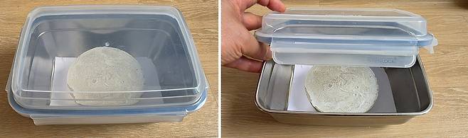 | ▲ 스테인리스 밀폐 반찬통에 잘 건조한 콘크리트를 넣고 2~3일 뒤 뚜겅을 열고 악취를 맡아보라. |