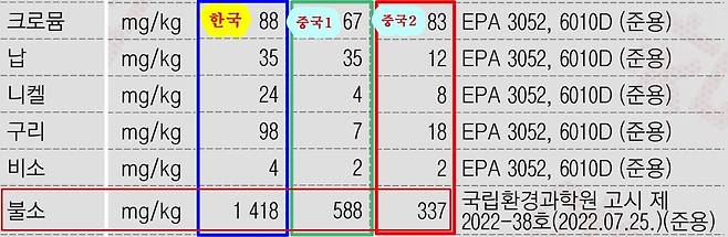| ▲ 시멘트 성분 분석 결과, 한국시멘트와 중국시멘트의 유해물질 차이가 크게 나타났다. |