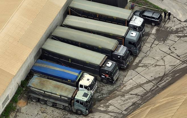| ▲ 한국 시멘트 공장 창고 앞에 줄지어 대기 중인 대형 트럭들 |