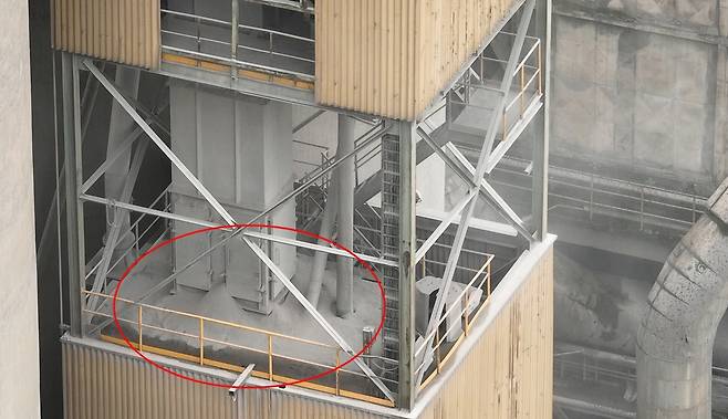 | ▲ 지난 8월 쌍용시멘트 영월공장에 분진이 날리고 있었다. 자세히 살펴보니 시멘트 가루가 쏟아져 나오고 있다. |