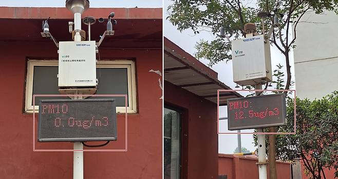 | ▲ 중국 시멘트 공장에 분진이 없음을 보여주는 대기오염 측정기. 결과가 놀라웠다. |