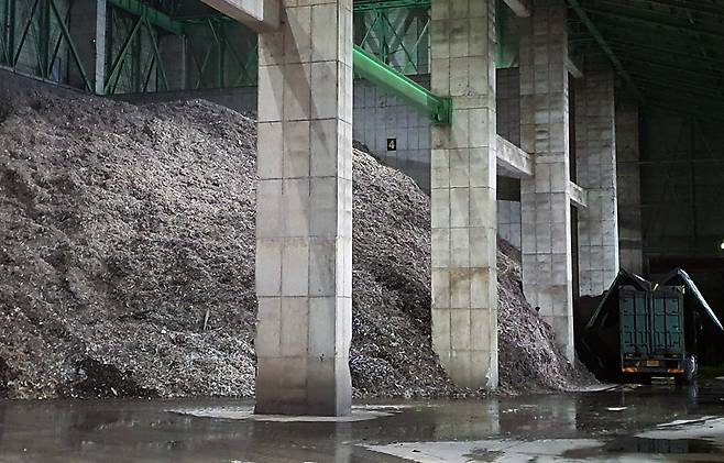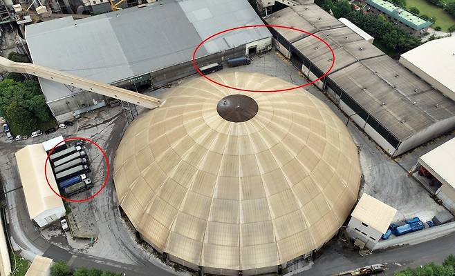 | ▲ 시멘트 공장의 대형 창고마다 잘게 파쇄하여 반입한 쓰레기들이 산을 이루고 있다. 쓰레기를 하역 중인 트럭이 보인다. |