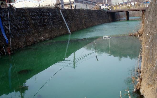 | ▲ 2007년, 쌍용시멘트 영월공장에서 응결지연제로 사용하는 폐부동액이 유출되어 인근 하천을 오염시키는 사건이 있었다. |