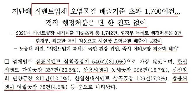 중국 관계자의 '공장 폐쇄'라는 대답이 믿기지 않았지만, 한국의 시멘트 공장들이 변화하지 않는 이유를 찾을 수 있었다. 지난 2022년 7월 17일 노웅래 전 의원은 '한국의 시멘트 공장들이 지난 2021년 오염물질 배출 기준 초과 건수가 1700여 건이 넘음에도 불구하고, 정작 행정처분을 받은 사례가 단 한 건도 없다'라며 환경부 자료를 공개했다.