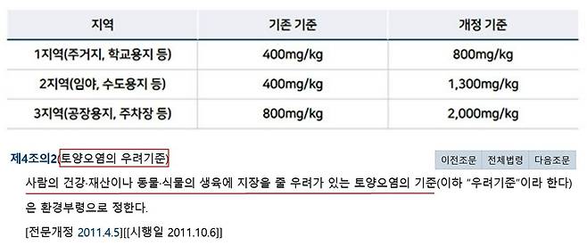 지난 2024년 12월 12일 토양환경보전법이 개정되어 불소의 토양오염 우려기준이 완화되었다. 주거지, 학교용지 등의 1주거지의 불소 기준이 400mg/kg에서 800mg/kg으로 완화되었고, 2지역은 400mg/kg에서 1300mg/kg, 3지역은 800mg/kg에서 2000mg/kg으로 크게 완화되었다.