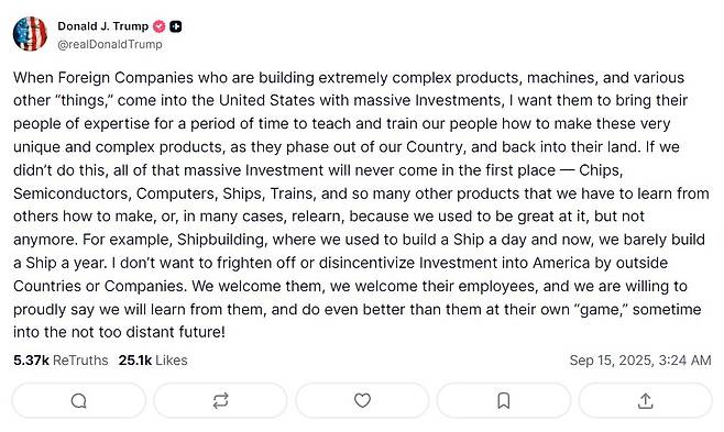 트럼프 대통령이 이 글에서 특정 국가나 기업을 언급하지는 않았으나, 최근 미 이민 당국이 조지아주의 현대차그룹-LG에너지솔루션 합작 배터리공장 건설 현장에서 한국인 317명을 포함해 475명을 체포·구금한 사태를 의식한 것으로 보인다.