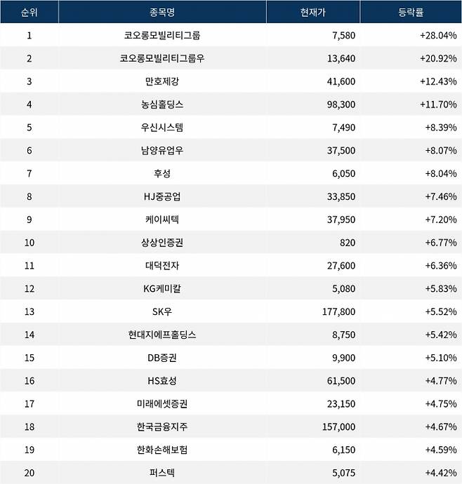 6위 남양유업우(003925)는 현재가 37,500원으로 8.07% 상승 중이다. 7위 후성(093370)은 현재가 6,050원으로 8.04% 상승 중이다. 8위 HJ중공업(097230)은 현재가 33,850원으로 7.46% 상승 중이다. 9위 케이씨텍(281820)은 현재가 37,950원으로 7.20% 상승 중이다. 10위 상상인증권(001290)은 현재가 820원으로 6.77% 상승 중이다.