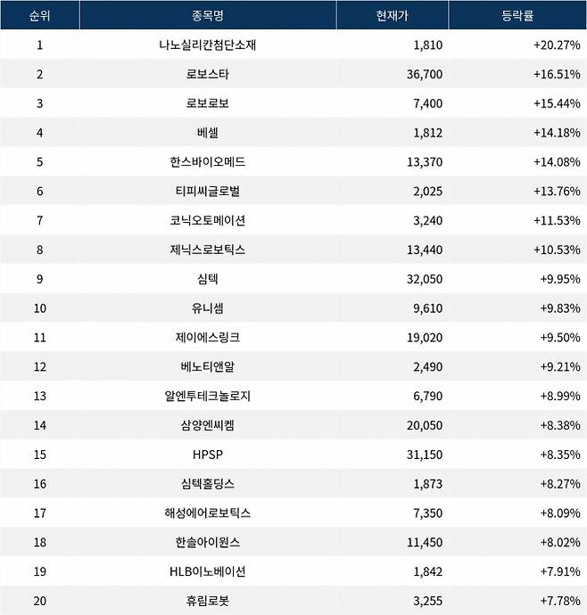 6위 티피씨글로벌(130740)은 현재가 2,025원으로 13.76% 상승 중이다. 7위 코닉오토메이션(391710)은 현재가 3,240원으로 11.53% 상승 중이다. 8위 제닉스로보틱스(381620)는 현재가 13,440원으로 10.53% 상승 중이다. 9위 심텍(222800)은 현재가 32,050원으로 9.95% 상승 중이다. 10위 유니셈(036200)은 현재가 9,610원으로 9.83% 상승 중이다.