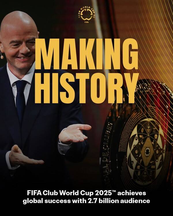 [SPORTALKOREA] 배웅기 기자= 올해 새롭게 확대 개편된 2025 국제축구연맹(FIFA) 클럽 월드컵이 전 세계 팬들의 높은 관심에 힘입어 흥행에 성공했다. 축구 통계 매체 '닐슨 스포츠'의 집계에 따르면 무려 약 27억 명이 시청한 것으로 추산됐다. FIFA는 "기대 이상의 성과를 거뒀다"고 자평했다.