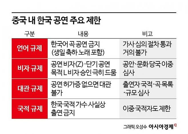 ◆한국어 공연 금지·비자 발급 불허= 현재 중국은 한국어 노래 공연을 사실상 금지하고 있다. 한 공연 관계자는 "팬미팅에서도 한국어 곡을 부를 수 없고, 생일 축하 노래조차 제재 대상"이라고 전했다. 원래 중국은 가사 규제가 까다로워 심의를 거쳐야 공연이 가능하다. 그러나 K팝 가사 대부분이 제한을 받아, 현실적으로 수정·승인 절차를 통과하기 어렵다.