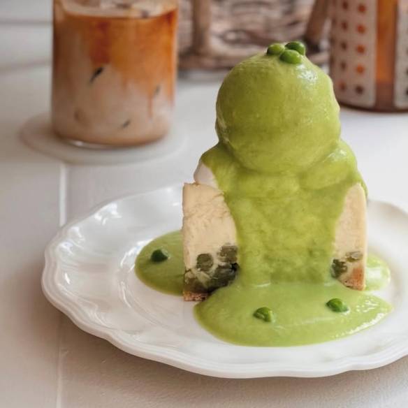 망원동에 위치한 카페 리브 인 오후의 인기 메뉴 완두완두 치즈 케이크. 플레인 치즈 케이크에 완두 앙금을 샌드하고 여기에 수제 완두콩 아이스크림과 퓨레를 올려 진한 완두의 맛을 살렸어요.