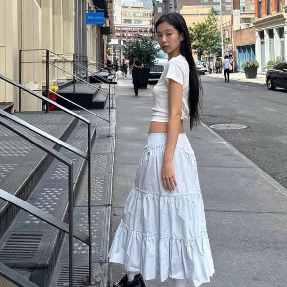 지금 가장 러블리하면서 스타일리시해보이는 아이템 중 하나를 꼽으라면 바로, 롱 티어드스커트가 있습니다. 2000년대를 주름 잡았던 이 캉캉 스커트는 y2k 트렌드를 타고 다시 돌아와 패션 피플들의 애착템이 되었죠.