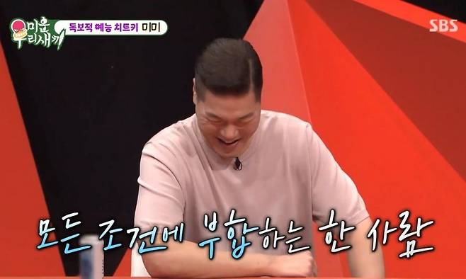 신동엽은 "그래서 그런지 이상형이 보통이 아니다"며 "'키 크고 착하고 활동적이고 재산이 많고 소중한 사람들에게 잘하며 운동도 잘하고 싸움도 잘하고 입냄새가 나지 않는 사람'이라고 한다"며 구체적인 미미의 이상형 조건을 설명했다.