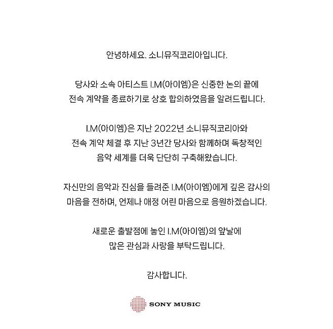 이들은 “I.M(아이엠)은 지난 2022년 소니뮤직코리아와 전속 계약 체결 후 지난 3년간 당사와 함께하며 독창적인 음악 세계를 더욱 단단히 구축해왔다. 자신만의 음악과 진심을 들려준 I.M(아이엠)에게 깊은 감사의 마음을 전하며, 언제나 애정 어린 마음으로 응원하겠다”고 말했다. 그러면서 “새로운 출발점에 놓인 I.M(아이엠)의 앞날에 많은 관심과 사랑을 부탁드린다”고 전했다.