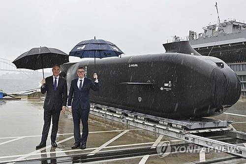 [지난 10일(현지시간) 호주 시드니에서 공개된 대형 무인잠수정(UUV) '고스트 샤크' 시제품 앞에 리처드 말스 호주 부총리 겸 국방부 장관(왼쪽)과 패트 콘로이 호주 방위사업부 장관이 서 있다.(AP=연합뉴스)]