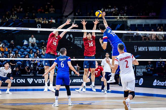 한국은 지난 14일 필리핀 케손시티에서 열린 2025 국제배구연맹(FIVB) 남자배구 세계선수권대회 C조 조별리그 1차전에서 프랑스에 세트스코어 0-3(12-25 18-25 16-25)으로 패했다.