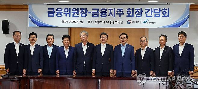 (서울=연합뉴스) 한종찬 기자 = 이억원 금융위원장(왼쪽 여섯번째)이 15일 서울 중구 은행연합회에서 열린 금융위원장-금융지주 회장 간담회에서 참석자들과 기념촬영을 하고 있다. 왼쪽부터 이찬우 농협금융지주회장, 빈대인 BNK 금융지주회장, 김기홍 JB금융지주회장, 함영주 하나금융지주회장, 임종룡 우리금융지주회장, 이 위원장, 조용병 은행연합회장, 양종희 KB금융지주회장, 진옥동 신한금융지주회장, 황병우 iM금융지주회장. 2025.9.15
